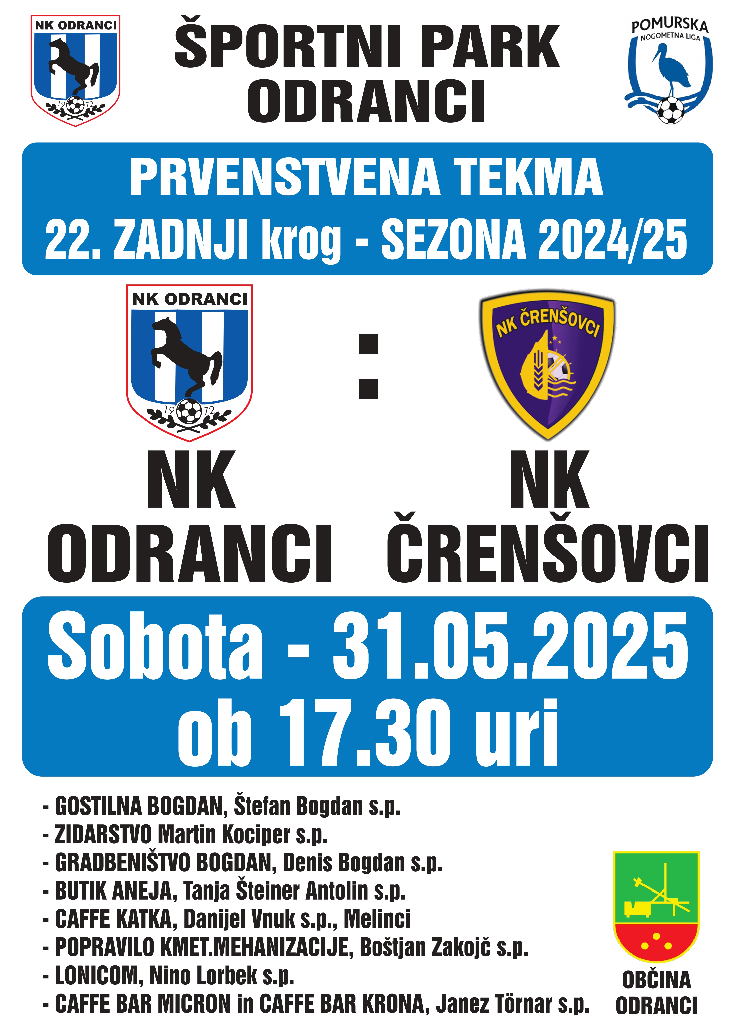 S sobotnim obračunom Odranci – Črenšovci bo padel zastor pod letošnjo PNL, vsaj kar se vrha lestvice tiče. Naša ekipa bo še tretjič v svoji zgodovini dvignila pokal za naslov prvaka PNL, kar ji je prvič uspelo 20 let nazaj. Vmes je naš klub še 2x postal prvak 3.SNL-vzhod. Sobotni sosedski obračun proti Črenšovcem torej ne bo odločal praktično o ničemer. Bo pa za našo ekipo vseeno pomemben, saj bo služil kot generalka pred dvema kvalfikacijskima obračunoma za popolnitev 3.SNL-vzhod, v katerih je žreb za nasprotnika naši ekipi namenil, še prejšnjo sezono prvoligaša, sedaj pa aktualnega prvaka MNZ Celje, ekipo Rogaške.